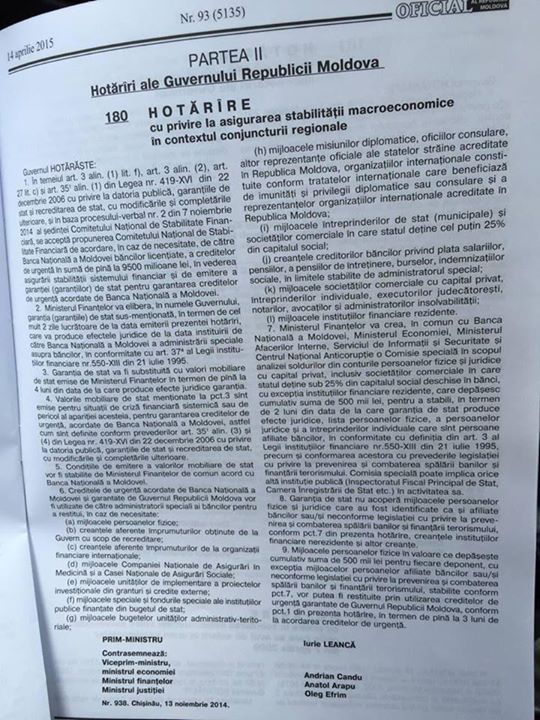 13 ноября 2014 года правительство Лянкэ принимает тайное решение предоставить кредит в размере 9,5 миллиарда леев трем банкам.
