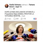 "После последнего исторического заявления президента Майи Санду о будущем воссоединении румын из двух румынских государств возникает лишь один вопрос, не терпящий отлагательств: станет или не станет Майя Санду вторым Александру Иоаном Кузой румынского народа?... Да поможет нам добрый Бог, который с нами и добр к нам, как истинный румын!".