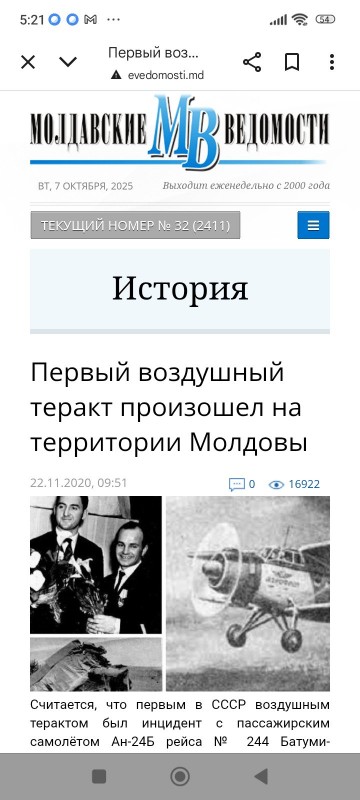 22 ноября 2020 года «Молдавские ведомости» опубликовали статью о первом воздушном теракте в СССР, который произошел на территории Молдовы 29 сентября 1964 года. Рейс Чадыр-Лунга - Измаил выполнял небольшой 12-местный «кукурузник» АН-2 с пятью пассажирами на борту, двое из которых намеревались угнать самолет в Турцию.