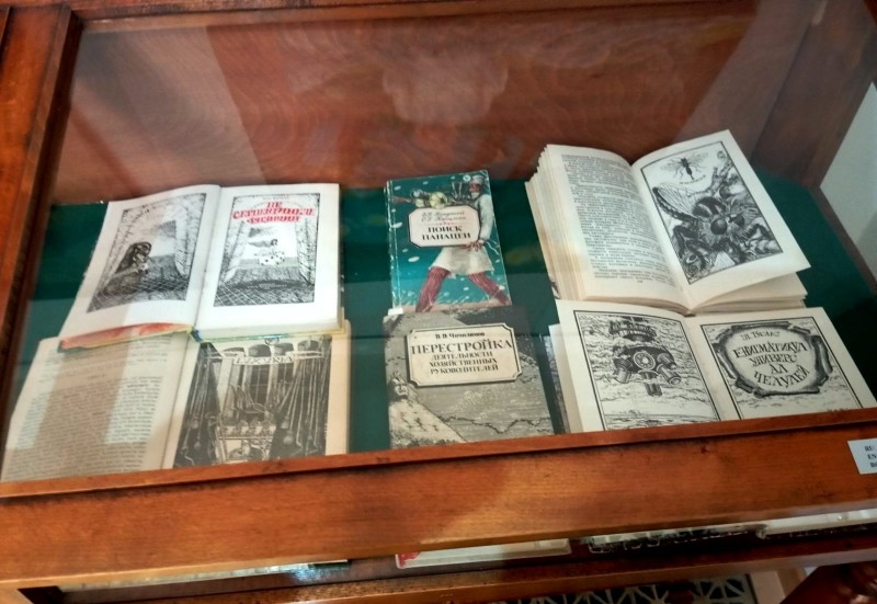 В витринах можно ознакомиться с художественными, научно-популярными, детскими книгами, которые талантливо проиллюстрировал художник. Циклы его иллюстраций отмечены дипломами I и II степеней на республиканских и всесоюзных конкурсах «Искусство книги». Знатоки неизменно отмечают высокий профессионализм автора. Восхищает его фантазия, органичное сочетание в работах иронии, сатиры, сарказма и глубокой философии.