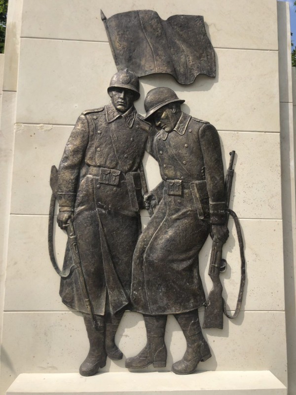 Шинель на раненом наглухо застегнута, лицо начисто лишено эмоций. Оружие: что за конструктор лего в руках у румын? Гибрид систем Маузера, Бердана и Манлихера? Монументальная скульптура, особенно на военную тему, не терпит таких собирательных образов. Оружие – неотъемлемая часть фигуры воина: должно быть понятно, что в руках у него пулемет Дегтярева, винтовка Мосина или пистолет-пулемет Шпагина. Так к этому относились советские скульпторы.